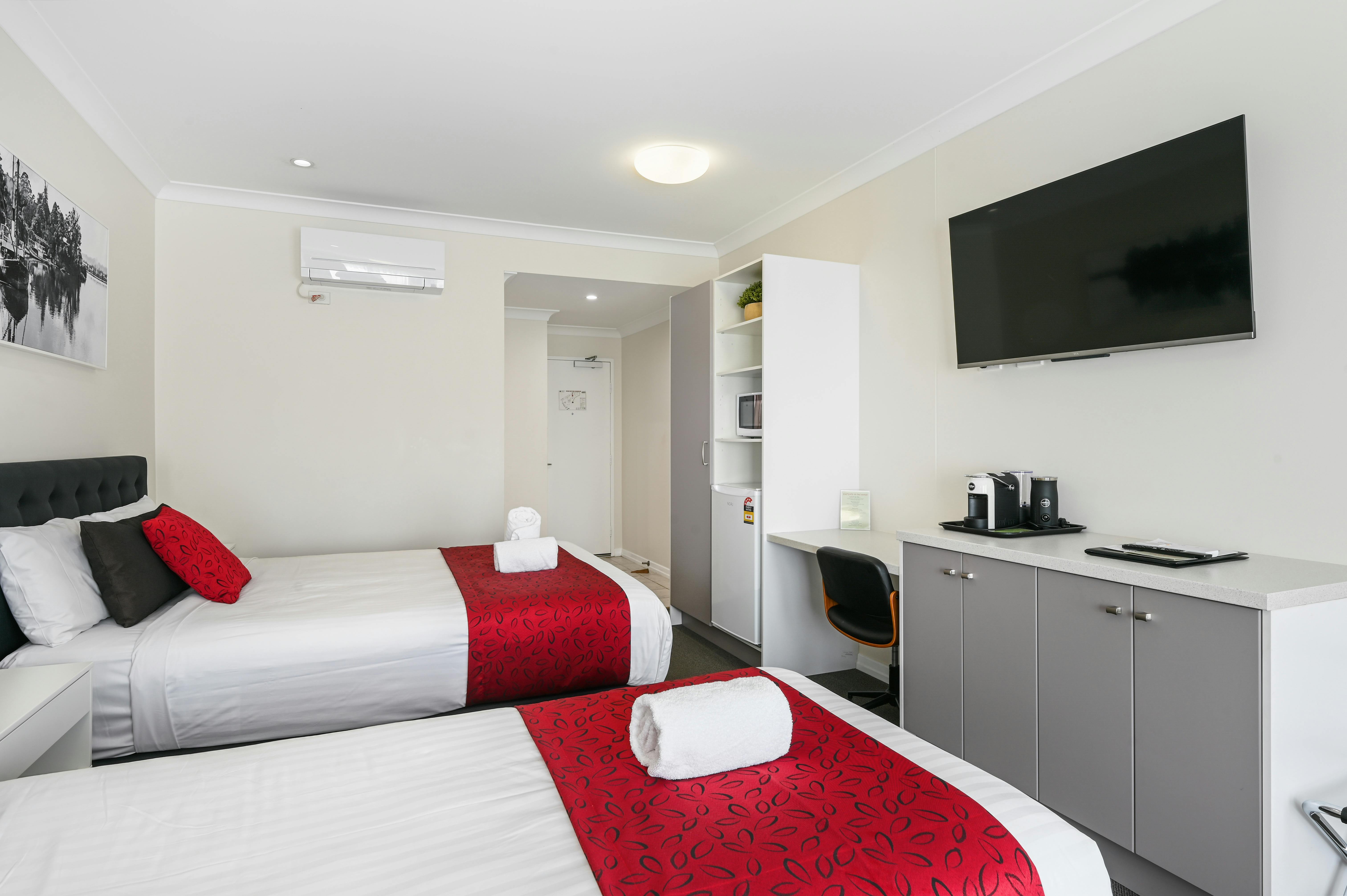 Recently Refurbished spacious room with a Queen and Single Bed. Smart TV, Complimentary Wi-Fi, Bottled Water, Microwave, Crokery and Cutlery, Tea & Coffee Making Facilities, Desk, Reverse cycle Air Conditioning. Ground Floor Access and Coffee Pod Machine